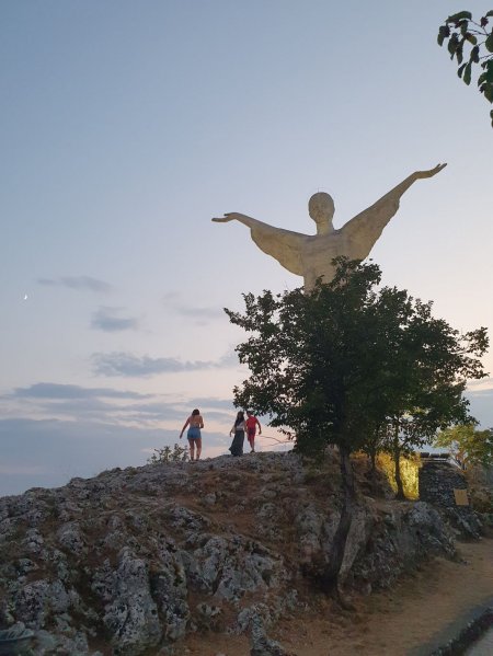 Vista mare e giardino con terrazzo privato attrezzato con tavolo, due sedie e stendi biancheria.