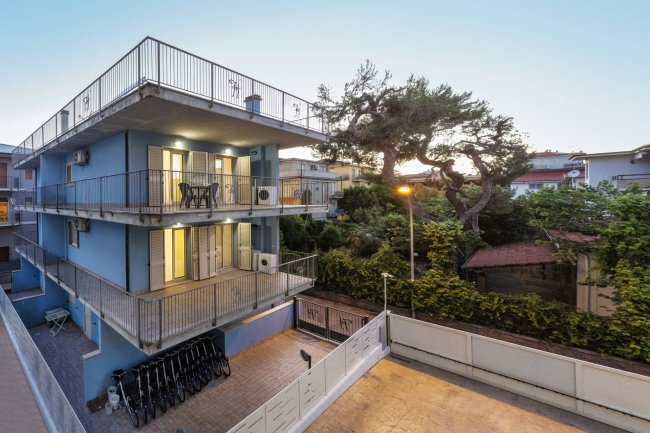 Edificio blu a tre piani con balconi e biciclette.