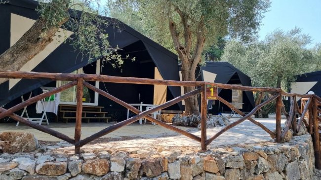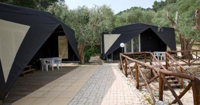 Tenda con terrazza di legno, vista piscina e ulivi.