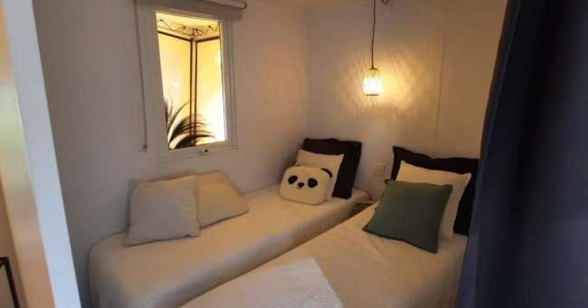 camera matrimoniale, zona giorno con letti singoli, angolo cottura, bagno con doccia, tv, ventilatori e veranda esterna coperta attrezzata.