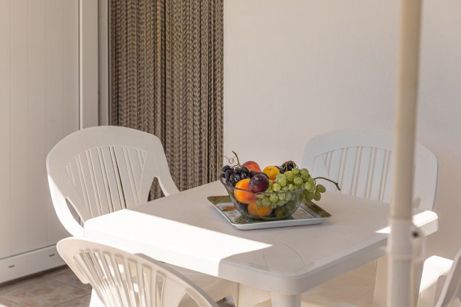 Piccola casa bianca con tavolo e sedie all'esterno.