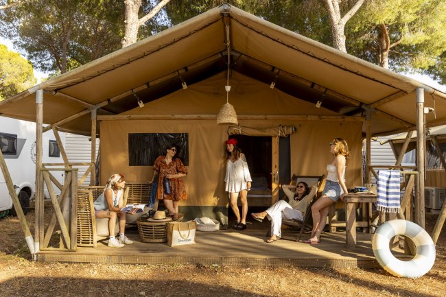 L'esperienza più originale dell'estate. Tenda attrezzata composta da: camera matrimoniale e camera con due letti singoli. Ingresso con frigo, piccolo tavolo, 2 sgabelli e vani portaoggetti. Biancheria da letto e a bagno non inclusa. Patio arredato con tavolo e sedie. No angolo cottura.